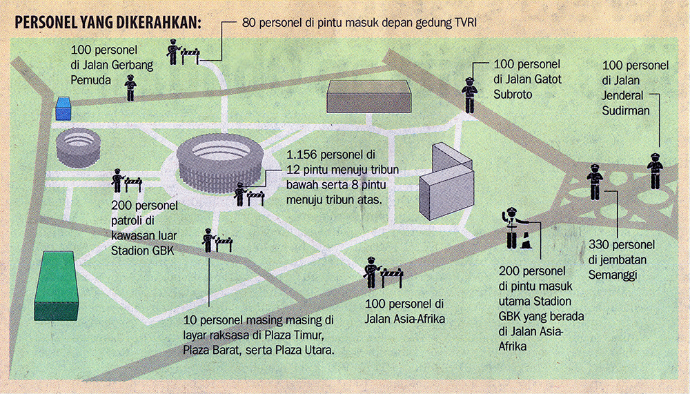 - Ilustrasi polisi bersenjata laras panjang dan palang pembatas jalan di ujung jalur putih bawah pada Jalan Pintu Gelora 1, dengan keterangan, "10 personel masing-masing di layar raksasa di Plaza Timus, Plaza Barat, serta Plaza Utara."